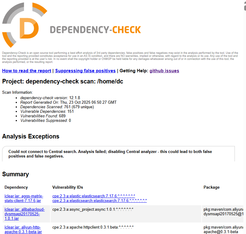 即可。完成后会在当前目录生成一个 odc-reports 目录,里面有个 dependency-check-report.html
